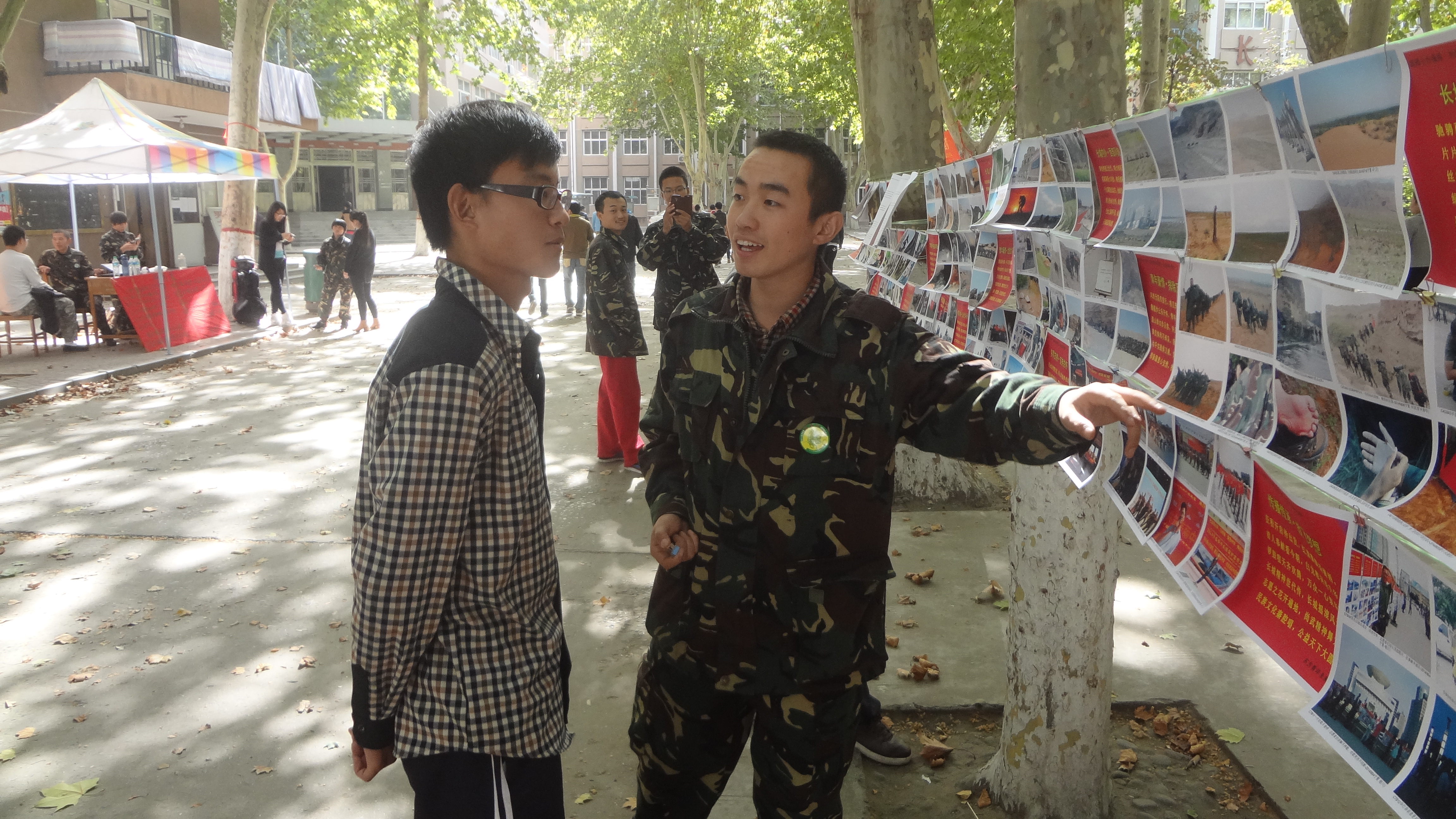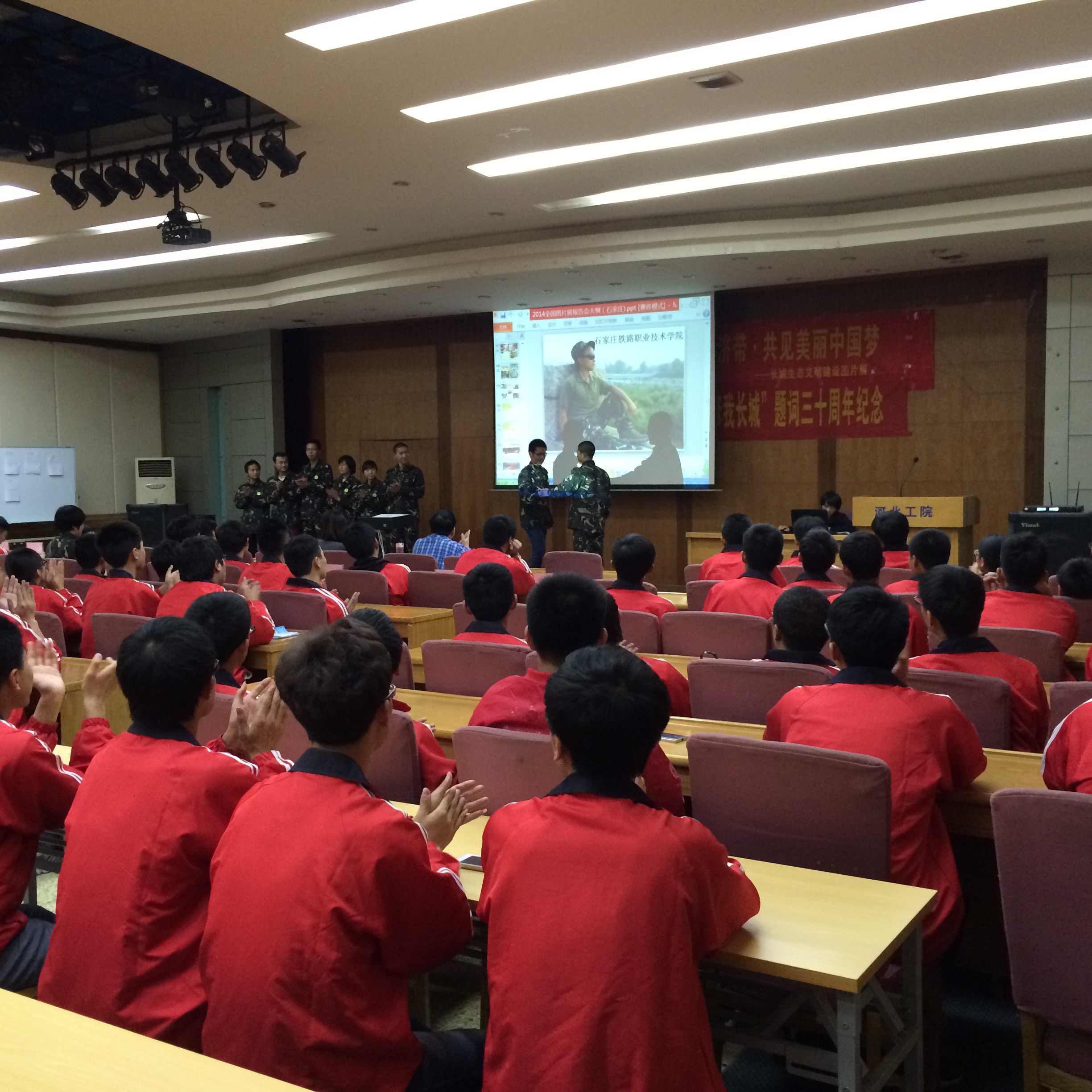 志愿者们为前来参观的同学们讲解了2014张图片故事,包括长城古今的故事,志愿者们徒步的经历故事等。图片和故事相得益彰,描述了长城沿线的壮美,展示了祖国山川的魅力,述说了生态中国的梦想。当晚,在学院北校区五楼报告厅举行“共建社会主义核心价值观·共建长城经济带·共筑美丽中国梦”图片展志愿者报告会,徒步青年志愿者们给大家讲述了自己在活动中的经历、见闻与收获,用自己的亲身经历和大家分享自己在活动中的快乐、坎坷与成长,老师、学生代表与志愿者们进行了亲密互动,使大家更好的认识到了当前经济高速发展时期长城的价值和青年肩负的历史使命。
