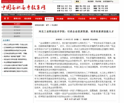 6月20日,中国高职高专教育网以“引进企业优质资源,培养高素质技能人才”为题,关注并报道了我院与长安福特汽车有限公司校企合作项目。