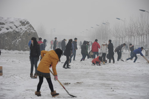 在南校区通往教学区的主干道上,建筑工程系、自动化系和计算机系的师生共同努力,赶在大家上课前把道路积雪清扫干净。办公楼前,学院教职工一起动手,将办公楼前小广场清理一空。在北校区,机电系的师生合力不但清扫了院内道路积雪,还将校门口的积雪残冰扫除干净,为过往行人提供便利。