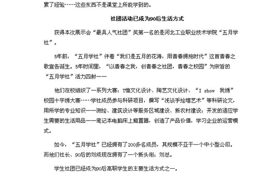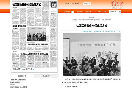 人民网、《中国青年报》、中青在线,2012年11月12日 以“社团活动已成90后生活方式”为题,大篇幅报道我院五月学社建设模式。