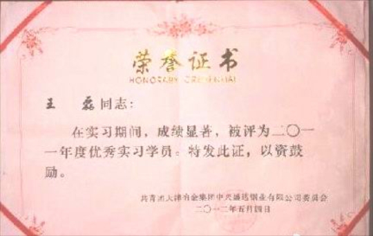 近日,从企业传来喜讯,我院材料工程系2009级冶金设备应用与维护专业学生王磊,在天津冶金集团中兴盛达有限公司顶岗实习期间,荣获“优秀实习学员”荣誉称号。