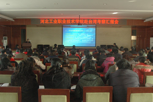 为创新办学体制机制,推进四年制技术应用教育,探索高端技能型人才专业硕士培养制度,了解台湾地区职业教育体系建设情况,我院于2010年和2011年选派两批干部赴台进行考察。在汇报会上,赴台考察人员共分六组进行了汇报。汇报人员就台湾职教发展与体系、办学体制与机制、师资队伍建设、课程与教学改革、研究所作用与借鉴、国际教育交流与合作、校园文化建设等诸多方面进行了分析、探讨与总结。